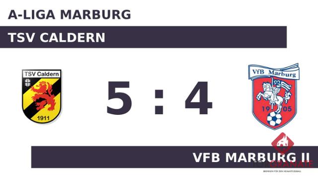 Eugen Maschke brachte den VfB Marburg II in der elften Minute ins Hintertreffen. Die passende Antwort hatte Serkan Erdem parat, als er in der 14. Minute zum Ausgleich traf. Für das 2:1 des TSV Caldern zeichnete Lukas Weis verantwortlich (16.). Der VfB Marburg II zeigte sich unbeeindruckt und so drehten Paul Jost (22.) und Lars Flühe (27.) mit ihren Treffern das Spiel. Der Gast hatte zur Pause eine knappe Führung auf dem Zettel stehen. Lancine Kourouma versenkte den Ball in der 47. Minute im Netz des VfB Marburg II. Durch einen Elfmeter von Erdem gelang dem VfB Marburg II das Führungstor. In der 61. Minute war Maschke mit dem Ausgleich zum 4:4 zur Stelle. Damit schoss er bereits seinen zweiten Treffer! Philip Mateja beförderte das Leder zum 5:4 des TSV Caldern in die Maschen (72.). Als Schiedsrichter Axel Rex (Battenberg) die Begegnung beim Stand von 5:4 letztlich abpfiff, hatte die Heimmannschaft die drei Zähler unter Dach und Fach.