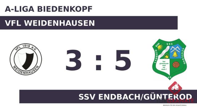Der SSV Endbach/Günterod ging mit einem Elfmeter von Nils Ellenfeld in Führung (1.). In der 18. Minute erhöhte Kevin Krenn auf 2:0 für die Gäste. Jan Niklas Becker schlug doppelt zu und glich damit für VFL Weidenhausen aus (37./45.). Eine Aussage darüber, wer am Ende die Nase vorn haben würde, war nach dem Abpfiff der ersten Halbzeit noch nicht zu treffen. Es ging mit einem Gleichstand in die Kabinen. Vitali Michajlow traf zum 3:2 zugunsten von VFL Weidenhausen (51.). Die Weidenhausener mussten den Treffer von Jonathan Heuser zum 3:3 hinnehmen (66.). Drei Minuten später ging der SSV Endbach/Günterod durch den zweiten Treffer von Ellenfeld in Führung. Nach der Beendigung des Spiels durch Schiedsrichter Thorsten Bepperling (Lahntal) feierte der SSV Endbach/Günterod einen dreifachen Punktgewinn gegen VFL Weidenhausen.