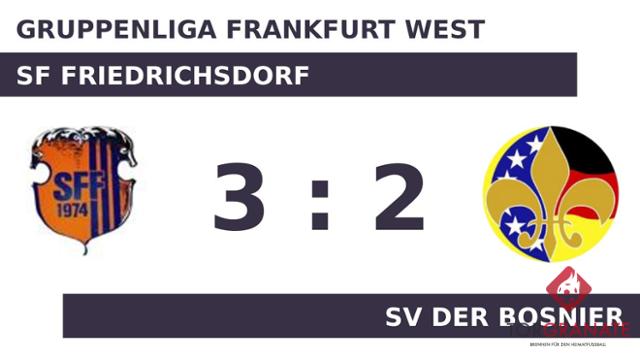 Turgay Akbulut versenkte die Kugel zum 1:0 (38.). Wenig später verwandelte Adis Hasecic einen Elfmeter zum 1:1 zugunsten des SV der Bosnier (44.). Wenige Momente vor dem Seitenwechsel war Hamza Reko mit dem 2:1 für den Sportverein der Bosnier zur Stelle (45.). Zur Pause wussten die Bosnier eine hauchdünne Führung auf der Habenseite. Bei SF Friedrichsdorf gab es ein neues Gesicht auf dem Platz: Christopher Skoczny wurde für Joschua Lyzcarz eingewechselt. Ab der 65. Minute bereicherte der für Kevin Asare Weber eingewechselte Okan Koyun den Tabellenprimus im Vorwärtsgang. Für das zweite Tor der Gastgeber war Pierre Massfeller verantwortlich, der in der 88. Minute das 2:2 besorgte. Der Schlusspfiff war zum Greifen nah, als Denis Talijan noch einen Treffer parat hatte (90.). Als Referee Johannes Collatz (Darmstadt) die Partie abpfiff, reklamierte SF Friedrichsdorf schließlich einen 3:2-Heimsieg für sich.