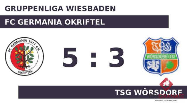 Die Heimmannschaft geriet schon in der achten Minute in Rückstand, als Luke Presber das schnelle 1:0 für die TSG Wörsdorf erzielte. Alim Göcek witterte seine Chance und schoss den Ball zum 1:1 für den FC Germania Okriftel ein (32.). Abdoulaye Junior Toure verwandelte in der 33. Minute einen Elfmeter und brachte der TSG Wörsdorf die 2:1-Führung. Die Wörsdorfer bejubelten noch das letzte Erfolgserlebnis, als Paul Lutterbüse für den Ausgleich sorgte (36.). Eine Aussage darüber, wer am Ende die Nase vorn haben würde, war nach dem Abpfiff der ersten Halbzeit noch nicht zu treffen. Es ging mit einem Gleichstand in die Kabinen. Göcek (51./77.) und Cedric Siewe Nana (72.) sorgten dafür, dass die Germania Okriftel überraschend mit 5:2 führte. In der 58. Minute stellte die TSG Wörsdorf personell um: Per Doppelwechsel kamen Paul Paulsen und Morad El Wardi auf den Platz und ersetzten Maximilian Gross und Atta Bajwa. Baldassar Nikolic beförderte das Leder zum 3:5 der TSG über die Linie (81.). Als Schiedsrichter Nico Petrovic (Egelsbach) die Begegnung beim Stand von 5:3 letztlich abpfiff, hatte der FC Germania Okriftel die drei Zähler unter Dach und Fach.