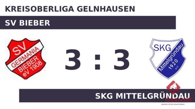 Für das erste Tor sorgte Sergei Eirich. In der 13. Minute traf der Spieler der SKG ins Schwarze. Bis zum Halbzeitpfiff blieb der knappe Vorsprung der Mittelgründauer bestehen. In der Pause stellte der SV Bieber personell um: Per Doppelwechsel kamen Mert Kahveci und Patrick Amberg auf den Platz und ersetzten Mustafa Dapar und Paul Genz. Für das 1:1 des SVB zeichnete Haris Dudevic verantwortlich (55.). Oliver Kraus versenkte den Ball in der 64. Minute im Netz der Germania. Die SKG Mittelgründau musste den Treffer von Amberg zum 2:2 hinnehmen (85.). In der 89. Minute erzielte Calogero Capobianco das 3:2 für den SV Bieber. Kurz vor dem Ende des Spiels jubelte Kraus mit seinen Teamkollegen über seinen Treffer in der 90. Minute, der einen Gleichstand herbeiführte. Am Ende stand es zwischen dem SV Bieber und der SKG Mittelgründau pari.