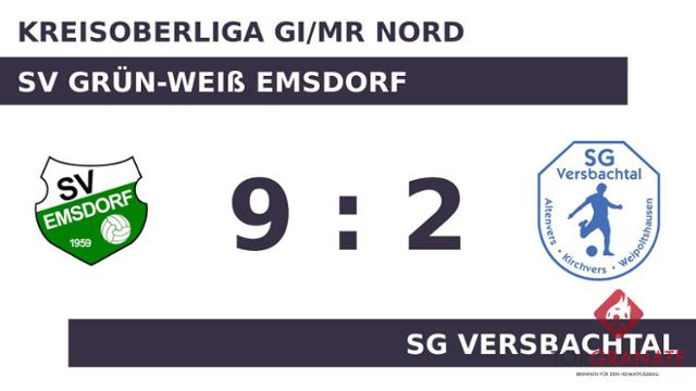 Der Gast geriet schon in der neunten Minute in Rückstand, als Jonas Kläs das schnelle 1:0 für den SV Grün-Weiß Emsdorf erzielte. Dominik Schorat musste nach nur 18 Minuten vom Platz, für ihn spielte Leon Steinbrueck weiter. Kurz vor dem Pausenpfiff erhöhte Nico Fehrentz den Vorsprung des SV Emsdorf auf 2:0 (41.). Kurz vor dem Seitenwechsel legte Dennie Losekam das 3:0 nach (43.). Der SV Grün-Weiß Emsdorf dominierte den Gegner zur Pause nach Belieben und ging mit einer deutlichen Führung in die Kabine. Jannik Burk (46.) und Sinan Görgülü (51.) trafen innerhalb weniger Minuten zur Vorentscheidung des Ligaprimus. Anstelle von Steinbrueck war nach Wiederbeginn Rene Anders für die SG Versbachtal im Spiel. Der SV Emsdorf konnte mit dem ersten Durchgang sehr zufrieden sein. Trotzdem gab es Veränderungen bei den Gastgebern. Görgülü ersetzte Fehrentz, der nun schon vorzeitig Feierabend machte. In der 60. Minute stellte der SV Grün-Weiß Emsdorf personell um: Per Doppelwechsel kamen Jonas Mueller und Ramon Lauer auf den Platz und ersetzten Burk und Manuel Sprenger. Das 1:5 der SG Versbachtal stellte Marvin Ruehl sicher (62.). Innerhalb weniger Minuten trafen David Fröhlich (67.) und Lauer (71.). Damit bewies der SV Emsdorf nochmals die Durchschlagskraft der Offensive. Manuel Findt versenkte den Ball in der 72. Minute im Netz des SV Grün-Weiß Emsdorf. Der SV Emsdorf baute den Vorsprung mit der Hilfe des Gegners weiter aus: 8:2 für den SV Grün-Weiß Emsdorf durch ein Eigentor der SG Versbachtal in der 75. Minute. Losekam besorgte in der Schlussphase schließlich den neunten Treffer für den SV Emsdorf (89.). Mit dem Schlusspfiff durch den Unparteiischen Dennis Röhling (Frankenau) fuhr der SV Grün-Weiß Emsdorf einen Kantersieg ein, der sich schon vor der Halbzeitpause abgezeichnet hatte.