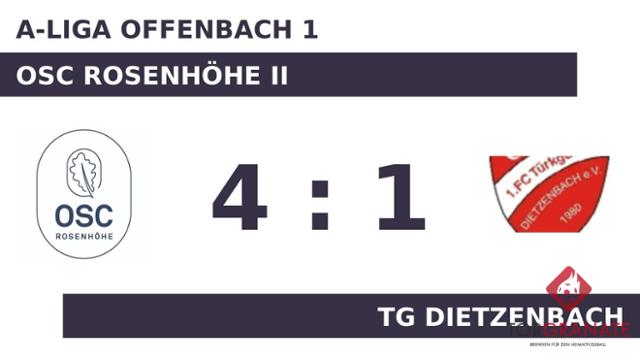 TG Dietzenbach geriet schon in der zehnten Minute in Rückstand, als Mike Osmanovski das schnelle 1:0 für den OSC Rosenhöhe II erzielte. Das 1:1 von TG Dietzenbach bejubelte Semih Yuezen (17.). Die nächsten beiden Treffer waren einem Mann vorbehalten: David Aronovici schnürte einen Doppelpack (32./44.), sodass der OSC Rosenhöhe II fortan mit 3:1 führte. Mit der Führung für den Gastgeber ging es in die Halbzeitpause. Lukas Höbel besorgte in der Schlussphase schließlich den vierten Treffer für den OSC Rosenhöhe II (90.). Schließlich erlitt TG Dietzenbach im direkten Aufeinandertreffen mit dem Abstiegskonkurrenten eine deutliche Niederlage.
