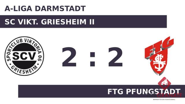 Auf die vermeintliche Siegerstraße brachte Timo Schmitt sein Team in der 30. Minute. Marc-Joel Reiss erhöhte den Vorsprung des SC Vikt. Griesheim II nach 35 Minuten auf 2:0. Mit der Führung für die Heimmannschaft ging es in die Halbzeitpause. Zum Seitenwechsel ersetzte Antonio Sabatino von der FTG Pfungstadt seinen Teamkameraden Daniel Schmeichel. Die Einwechslung von Denis Kosciuk, welcher für Justin Mueller kam, sollte das Schlusslicht wachrütteln (60.). Der Vikt. Griesheim II stellte in der 60. Minute mit einem Dreifachwechsel groß um und schickte Athanasios Kaparelis, Marcel Helfmann und k.A. k.A. für Kristian Medved, Salim Eladak und Eren Hasan Toprak auf den Platz. Das 1:2 der FTG Pfungstadt bejubelte Kosciuk (70.). Die komfortable Halbzeitführung des SC Vikt. Griesheim II hielt nicht bis zum Abpfiff, denn Kevin Leiss schoss den Ausgleich in der 81. Spielminute. Gedanklich hatte der Vikt. Griesheim II den Sieg bereits sicher, doch eine famose Aufholjagd sicherte der FTG Pfungstadt am Ende noch den Teilerfolg.