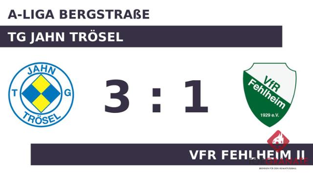 Mit der knappen Führung der Gäste pfiff der Schiedsrichter zur Halbzeit. Mit dem Schlusspfiff durch den Referee siegte die TG Jahn Trösel gegen den VFR Fehlheim II.