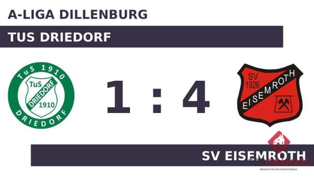 Der SV Eisemroth legte los wie die Feuerwehr und ließ durch einen Doppelschlag von Björn Diebel aufhorchen (6./11.). In der 33. Minute erzielte Eugen Gergert das 1:2 für den TuS Driedorf. Das 3:1 für den SV Eisemroth stellte Diebel sicher. In der 39. Minute traf er zum dritten Mal während der Partie. Es waren die Gäste, die zur Pause eine Führung ihr Eigen nannten. Dino Duvnjak baute den Vorsprung des SV Eisemroth in der 75. Minute aus. Letztlich fuhr der SV Eisemroth einen souveränen Erfolg ein, dessen Grundstein im ersten Spielabschnitt gelegt worden war.