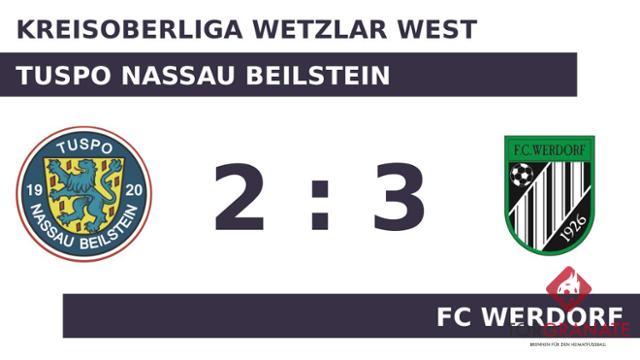 Kaum war das Spiel angepfiffen, lagen die Gastgeber bereits in Front. Darius Herzler markierte in der ersten Minute die Führung. Niklas Schleifer war es, der in der 24. Minute den Ball im Tor des TuSpo Nassau Beilstein unterbrachte. Kurz vor dem Seitenwechsel legte Benjamin Wolf das 2:1 nach (44.). Der FC Werdorf nahm die knappe Führung mit in die Kabine. Angus Patrick Richter traf zum 2:2 zugunsten des TuSpo Beilstein (63.). Gefeierter Mann des Spiels war Wolf, der dem FC Werdorf mit seinem Treffer in der 89. Minute den Vorsprung brachte. Am Schluss gewann der FC Werdorf gegen den TuSpo Nassau Beilstein.