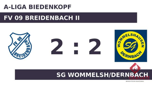 Christian Maser brachte die Gäste in der 18. Minute nach vorn. Zum Abpfiff der ersten Halbzeit hatte die SG Wommelsh/Dernbach einen knappen Vorsprung herausgespielt. Johan Seipp versenkte die Kugel zum 2:0 für das Wommelsh/Dernbach (50.). Marcel Eckhardt verkürzte für die Zweitvertretung des FV 09 Breidenbach später in der 59. Minute auf 1:2. Das 2:2 des Heimteams bejubelte Marvin Lauber (74.). Nach einer deutlichen Führung wähnte die SG Wommelsh/Dernbach die Schäfchen bereits im Trockenen. Doch der FV Breidenbach II stemmte sich gegen die drohende Niederlage und holte am Ende noch ein Remis.
