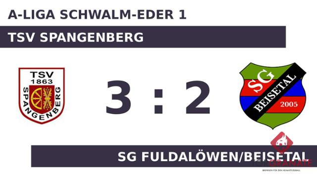 Marco Strube brachte den Ball zum 1:0 zugunsten des TSV Spangenberg über die Linie (29.). Fuldalöwen/Beisetal glich bis zum Halbzeitpfiff nicht mehr aus. Schließlich schickte Referee Patrick Specht (Borken (Hessen)) beide Teams mit der knappen Führung für den TSV Spangenberg in die Kabinen. In der 49. Minute erhöhte Jonas Breyther auf 2:0 für den TSV Spangenberg. Für das erste Tor der SG Fuldalöwen/Beisetal war Denis Boedicker verantwortlich, der in der 56. Minute das 1:2 besorgte. Johannes Töpfer versenkte die Kugel zum 3:1 (62.). Lars Ostheim ließ sich in der 81. Minute nicht zweimal bitten und verwertete zum 2:3 für Fuldalöwen/Beisetal. Am Ende verbuchte der TSV Spangenberg gegen die Gäste einen Sieg.