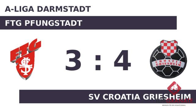Kevin Leiss brachte den SV Croatia Griesheim in der 13. Minute ins Hintertreffen. Das 1:1 des Gasts stellte Mate Tokic sicher (28.). Munir Avdic schoss für den SV Croatia Griesheim in der 30. Minute das zweite Tor. Doppelpack für den SV Croatia Griesheim: Nach seinem ersten Tor (42.) markierte Sasa Mlakic wenig später seinen zweiten Treffer (44.). Der dominante Vortrag des SV Croatia Griesheim im ersten Spielabschnitt zeigte sich an der deutlichen Halbzeitführung. Daniel Böck schoss die Kugel zum 2:4 für die FTG Pfungstadt über die Linie (65.). Kurz vor Ultimo war noch Antonio Sabatino zur Stelle und zeichnete für das dritte Tor der Heimmannschaft verantwortlich (86.). Letzten Endes holte der SV Croatia Griesheim gegen den Tabellenletzten drei Zähler.