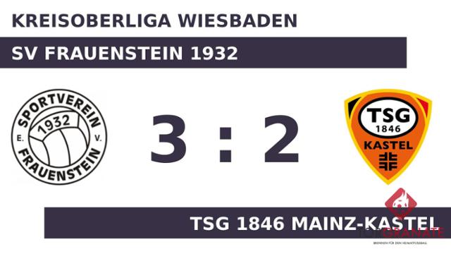 Rashid Khalil Qamar brachte der TSG 1846 Mainz-Kastel nach 16 Minuten die 1:0-Führung. Kevin Lenz nutzte die Chance für den Gast und beförderte in der 29. Minute das Leder zum 2:0 ins Netz. Es waren die Gäste, die zur Pause eine Führung ihr Eigen nannten. In der Halbzeit nahm der SV Frauenstein 1932 gleich zwei Wechsel vor. Fortan standen Badr Marzouki und Mika Jakob für Leutrim Jonuzi und Wenzel Böhm-Gräber auf dem Platz. Kevin Blum schlug doppelt zu und glich damit für den SV Frauenstein 1932 aus (60./80.). Wenig später kamen Raphael Isik und Burak Dere per Doppelwechsel für Lenz und Joel Roesler auf Seiten der TSG Kastel ins Match (62.). Die TSG 1846 Mainz-Kastel kam nicht mehr ins Spiel zurück, Leon Lavizar brachte den SV Frauenstein 1932 sogar in Führung (87.). Die TSG Kastel ließ nach dem Wiederanpfiff stark nach und bot dem SV Frauenstein 1932 nicht mehr Paroli, sodass das Polster der ersten Halbzeit nicht einmal für ein Unentschieden reichte.