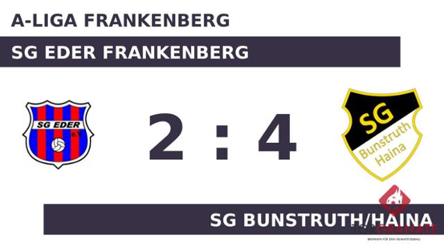 Die SG Bunstruth/Haina geriet schon in der siebten Minute in Rückstand, als Mario Giuda das schnelle 1:0 für die SG Eder Frankenberg erzielte. Zum psychologisch wichtigen Zeitpunkt kurz vor der Halbzeit (44.) traf George Adrian Vlasceanu zum Ausgleich für die SG Bunstruth/Haina. Zur Halbzeit war die Partie noch vollkommen offen. Remis lautete das Zwischenresultat. In der 53. Minute stellte die SG Eder Frankenberg personell um: Per Doppelwechsel kamen Leon Vogel und Fabrizio Paar auf den Platz und ersetzten Giuda und Paul Kretschmann. Für das zweite Tor der SG Bunstruth/Haina war Tomi Pilinger verantwortlich, der in der 55. Minute das 2:1 besorgte. In der 62. Minute erhöhte Andrei Vasile Moldovan auf 3:1 für den Spitzenreiter. Durch einen von Arne Vogel verwandelten Elfmeter gelang der SG Eder Frankenberg in der 74. Minute der 2:3-Anschlusstreffer. Romeo Ciprian Spetcu stellte wenige Minuten vor dem Schlusspfiff den Stand von 4:2 für die SG Bunstruth/Haina her (87.). Am Schluss gewann die SG Bunstruth/Haina gegen die SG Eder Frankenberg.