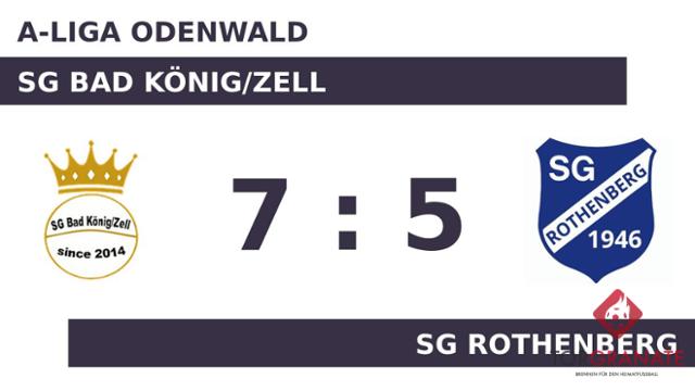 Auf die vermeintliche Siegerstraße brachte Steffen Heckmann sein Team in der 14. Minute. Das 1:1 der SG Bad König/Zell stellte Marco Reppe sicher (24.). Für das 2:1 und 3:1 war Nino Lorei verantwortlich. Der Akteur traf gleich zweimal ins Schwarze (26./32.). Ein Eigentor der SG Bad König/Zell in der 41. Minute brachte der SG Rothenberg den 2:3-Anschluss. Ein Tor auf Seiten der SG Bad König/Zell machte zur Pause den Unterschied zwischen den beiden Mannschaften aus. In der 53. Minute erzielte Jonas Hammann das 3:3 für die SG Rothenberg. Sercan Sezek machte in der 65. Minute das 4:3 der SG Bad König/Zell perfekt. Heckmann schockte das Heimteam und drehte die Partie mit seinem Doppelpack für die SG Rothenberg (67./78.). Stephan Geist ließ sich in der 85. Minute nicht zweimal bitten und verwertete zum 5:5 für die SG Bad König/Zell. Reppe brachte die SG Rothenberg per Doppelschlag ins Hintertreffen, als er in der 86. und 89. Minute vollstreckte. Schließlich strich die SG Bad König/Zell die Optimalausbeute gegen den Gast ein.