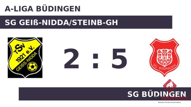 Das Heimteam geriet schon in der zehnten Minute in Rückstand, als Andreas Gkvritisvili das schnelle 1:0 für die SG Büdingen erzielte. Deniz Türk war es, der in der 18. Minute den Ball im Gehäuse der SG Büdingen unterbrachte. Mit einem schnellen Hattrick (36./38./42.) zum 4:1 schockte Almin Karalic das Geiß-Nidda/Steinb-GH. Die SG Büdingen gab in Durchgang eins klar den Ton an. Folgerichtig stand zur Pause eine klare Führung auf dem Zettel. Zum Seitenwechsel ersetzte Marcel Hannig von der SG Geiß-Nidda/Steinb-GH seinen Teamkameraden Nick Leon Fecher. Mit dem Treffer zum 2:4 in der 50. Minute machte Türk zwar seinen Doppelpack perfekt – der Rückstand zur SG Büdingen war jedoch weiterhin groß. Mit dem 5:2 sicherte Karalic der SGB nicht nur den Sieg, sondern erzielte auch seinen vierten Tagestreffer (86.). Letzten Endes ging die SG Büdingen im Duell mit dem Geiß-Nidda/Steinb-GH als Sieger hervor.
