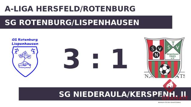 Das erste Tor des Spiels ging an Rotenburg/Lispenh. Allerdings gelang dies nur mithilfe der SG Niederaula/Kerspenh. II: 1:0 für die SG Rotenburg/Lispenhausen durch ein Eigentor in der 13. Minute. In der 18. Minute brachte Steffen Kanngießer das Netz für Rotenburg/Lispenh. zum Zappeln. Durch einen von Dennis Jäger verwandelten Elfmeter gelang Niederaula/Kersp. II in der 45. Minute der 1:2-Anschlusstreffer. Ein Tor auf Seiten der SG Rotenburg/Lispenhausen machte zur Pause den Unterschied zwischen den beiden Mannschaften aus. In der Pause stellte die SG Niederaula/Kerspenh. II personell um: Per Doppelwechsel kamen André Hirschhäuser und Valentin Braun auf den Platz und ersetzten Fabian Ruppel und Robin Herwig. In der Halbzeit nahm Rotenburg/Lispenh. gleich zwei Wechsel vor. Fortan standen Oleksander Ieremenko und Robin Walther für Patrik Schneider und Ayikoe Edem Josue Atayi auf dem Platz. Der Treffer von Alexander Wahl in der 65. Minute schürte bei Fans und Spielern die Hoffnung auf den Aufstieg. Als Schiedsrichter Vincenz Notarangelo (Burghaun) die Partie abpfiff, reklamierte die SG Rotenburg/Lispenhausen schließlich einen 3:1-Heimsieg für sich.