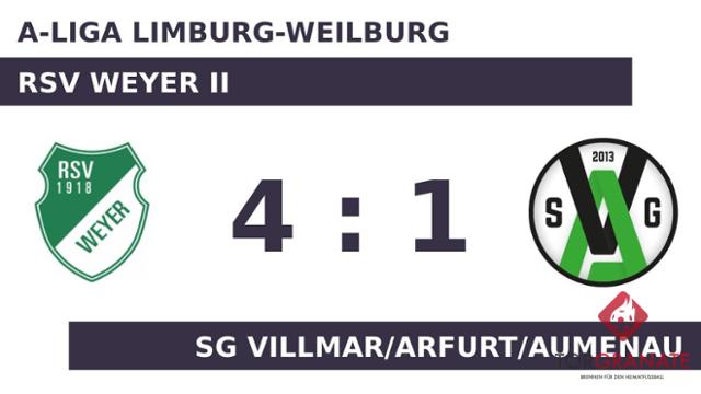 Der Gast geriet schon in der neunten Minute in Rückstand, als Tom Weber das schnelle 1:0 für den RSV Weyer II erzielte. Für das 1:1 des Villmar/Arfurt/Aum. zeichnete Felix Kremer verantwortlich (25.). Zur Halbzeit war die Partie noch vollkommen offen. Remis lautete das Zwischenresultat. In Durchgang zwei lief Joscha Rosenheinrich anstelle von Robin Dauksch für die SG Villmar/Arfurt/Aumenau auf. Mohammed Amin Al Mohammad versenkte die Kugel zum 2:1 (55.). In der 78. Minute brachte David Blecher das Netz für den RSV Weyer II zum Zappeln. Marcel Wagemann besorgte in der Schlussphase schließlich den vierten Treffer für das Heimteam (80.). Am Ende behielt der RSV Weyer II gegen das Villmar/Arfurt/Aum. die Oberhand.