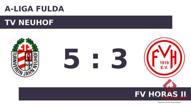 Auf die vermeintliche Siegerstraße brachte Jeremie Bonkoungou sein Team in der 19. Minute. Das 1:1 des TV Neuhof bejubelte Lukas Raab (39.). Bevor es in die Pause ging, hatte Florian Möller noch das 2:1 des Jahn parat (40.). Wer glaubte, der FV Horas II sei geschockt, irrte. Robert Babich machte unmittelbar nach dem Rückschlag den Ausgleich perfekt (42.). Zur Halbzeit war die Partie noch vollkommen offen. Remis lautete das Zwischenresultat. Mehmet Corumlu brachte dem TV Neuhof nach 58 Minuten die 3:2-Führung. Niklas Riedl versenkte die Kugel zum 4:2 für die Neuhofer (77.). Helson Quiala Sebastiao schoss für den FV Horas II in der 79. Minute das dritte Tor. Mit dem 5:3 sicherte Corumlu dem TV Neuhof nicht nur den Sieg, sondern erzielte auch seinen zweiten Tagestreffer (85.). Schließlich sprang für den Turnverein gegen den FV Horas II ein Dreier heraus.