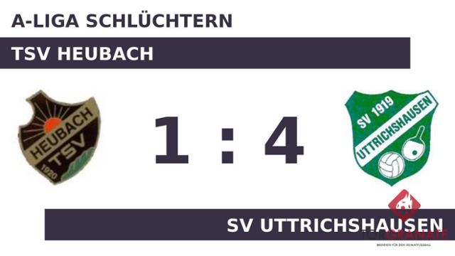Für den Führungstreffer des SV Uttrichshausen zeichnete Florian Ertel verantwortlich (29.). Zum psychologisch wichtigen Zeitpunkt kurz vor der Halbzeit (45.) traf Florian Manns zum Ausgleich für den TSV Heubach. Zur Pause stand ein Unentschieden, und für beide Mannschaften war noch alles drin. Beim SV Uttrichshausen gab es ein neues Gesicht auf dem Platz: Julian Geiling wurde für Robin Nüchter eingewechselt. Marius Muth trug sich in der 61. Spielminute in die Torschützenliste ein. Die nächsten beiden Treffer waren einem Mann vorbehalten: Ertel schnürte einen Doppelpack (71./88.), sodass der SV Uttrichshausen fortan mit 4:1 führte. Die 1:4-Heimniederlage des TSV Heubach war Realität, als Schiedsrichter Florian Wess (Eichenzell) die Partie letztendlich abpfiff.