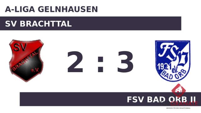 In Durchgang zwei lief Dennis Hemer anstelle von Simon Pfeifer für die Gäste auf. Nach den ersten 45 Minuten ging es für den SV Brachttal und den FSV Bad Orb II ohne Torerfolg in die Kabinen. Das 1:0 des SV Brachttal stellte Michel Siebert sicher (47.). In der 60. Minute erzielte Tobias Doeppenschmitt das 1:1 für den FSV Bad Orb II. Der SV Brachttal musste den Treffer von Christian Rieger zum 2:1 hinnehmen (63.). Wenig später kamen Jonathan Waider und Nico Wiederspahn per Doppelwechsel für Jonas Fink und Colin Rockel auf Seiten des SVB ins Match (66.). In der 77. Minute erhöhte Niklas Habermann auf 3:1 für den FSV Bad Orb II. Waider traf zum 2:3 zugunsten des SV Brachttal (90.). Zum Schluss feierte der FSV Bad Orb II einen dreifachen Punktgewinn gegen die Brachttaler.