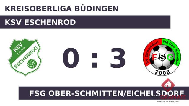 K. A. brachte sein Team in der 27. Minute nach vorn. Nach nur 27 Minuten verließ Ferdijan Idic vom O-Schmitten/Eichels. das Feld, David Tokarenko kam in die Partie. Mit der knappen Führung der FSG Ober-Schmitten/Eichelsdorf pfiff der Schiedsrichter zur Halbzeit. Aboubaker Benchaib trug sich in der 55. Spielminute in die Torschützenliste ein. Marcel Mautz verwandelte in der 75. Minute einen Elfmeter und baute den Vorsprung des O-Schmitten/Eichels. auf 3:0 aus. Mit dem Ende der Spielzeit strich die FSG Ober-Schmitten/Eichelsdorf gegen KSV Eschenrod die volle Ausbeute ein.