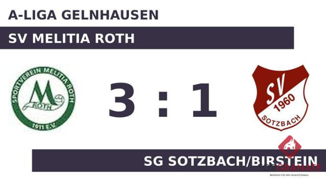 Die SG Sotzbach/Birstein geriet schon in der neunten Minute in Rückstand, als Peter Kroll das schnelle 1:0 für SV Melitia Roth erzielte. Ezzulddjn Raeed Yassen Al-Salman schoss die Kugel zum 2:0 für SV Melitia Roth über die Linie (22.). Mit der Führung für den Gastgeber ging es in die Halbzeitpause. Nico Hill war zur Stelle und markierte das 1:2 der SG Sotzbach/Birstein (46.). Zum Seitenwechsel ersetzte Nico Hill von der Spielgemeinschaft seinen Teamkameraden Gerd Guhlke. Steffen Franz erhöhte für SV Melitia Roth auf 3:1 (74.). Mit dem Schlusspfiff durch Schiedsrichter Klaus-Dieter Hamm (Dieburg) gewann SV Melitia Roth gegen die SG Sotzbach/Birstein.