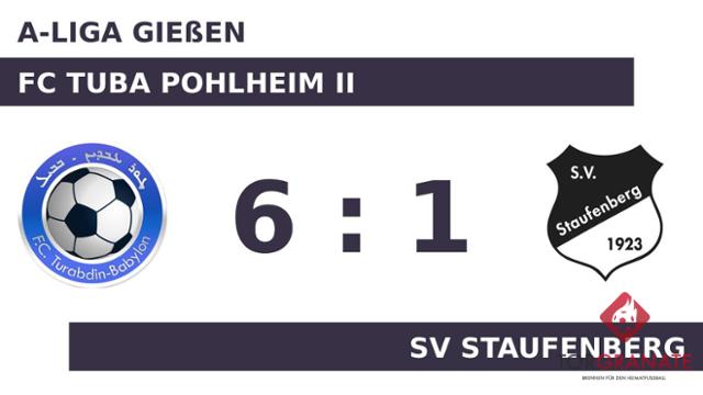 Mit der knappen Führung des FC TuBa Pohlheim II pfiff der Schiedsrichter zur Halbzeit. Letztlich kam der FC TuBa Pohlheim II gegen den SV Staufenberg zu einem verdienten 6:1-Sieg.
