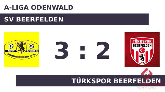 Türkspor Beerfelden erwischte einen Blitzstart ins Spiel. Canay Gün traf in der sechsten Minute zur frühen Führung. Den Freudenjubel des Gasts machte Dennis Brauch zunichte, als er kurz darauf den Ausgleich besorgte (11.). Fatih Sevindik musste nach nur 18 Minuten vom Platz, für ihn spielte Emre Kanat weiter. Kurz vor dem Pfiff zur Halbzeit machte Stefan Stefanovski das 2:1 zugunsten von Türkspor Beerfelden (45.). Zur Halbzeit war die Partie noch vollkommen offen. Remis lautete das Zwischenresultat. Zum Seitenwechsel ersetzte Felix Sasse vom SV Beerfelden seinen Teamkameraden Tim Bottelberger. Ilija Rupcic versenkte den Ball in der 53. Minute im Netz von Türkspor Beerfelden. Der Treffer zum 3:2 sicherte dem SV Beerfelden nicht nur die Führung – es war auch bereits der zweite von Brauch in diesem Spiel (71.). Schließlich holte die Heimmannschaft gegen den direkten Abstiegskonkurrenten die Big Points und feierte einen 3:2-Sieg.