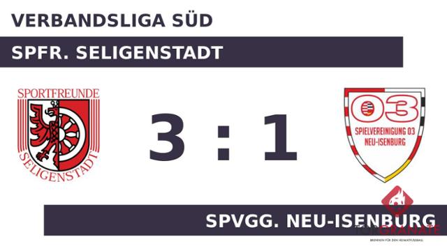 Ahmed Ben Bachir Diack musste nach nur neun Minuten vom Platz, für ihn spielte Jason Kunth weiter. Bis der Unparteiische Nikolas Czypull (Lautertal (Odenwald)) den ersten Durchlauf beendete, änderte sich am Zählerstand nichts mehr. Robin Weber schoss in der 57. Minute vom Elfmeterpunkt das erste Tor des Spiels für die Spfr. Seligenstadt. Die Seligenstädter stellten in der 70. Minute personell um: Jürgen Eißmann ersetzte Fabian Friess und damit ein nomineller Verteidiger den anderen. Das Heimteam tauschte zwei etatmäßige Verteidiger: Julian Purcell ersetzte Domagoj Filipovic (75.). In der 80. Minute erhöhte Giuseppe Serra auf 2:0 für die Spfr. Seligenstadt. Philip Jacobs war zur Stelle und markierte das 1:2 der Spvgg. Neu-Isenburg (86.). Ehe der Abpfiff ertönte, war es Philipp Traut, der das 3:1 aus Sicht der Spfr. Seligenstadt perfekt machte (89.). Unter dem Strich verbuchte die Spfr. Seligenstadt gegen die Spvgg. Neu-Isenburg einen 3:1-Sieg.