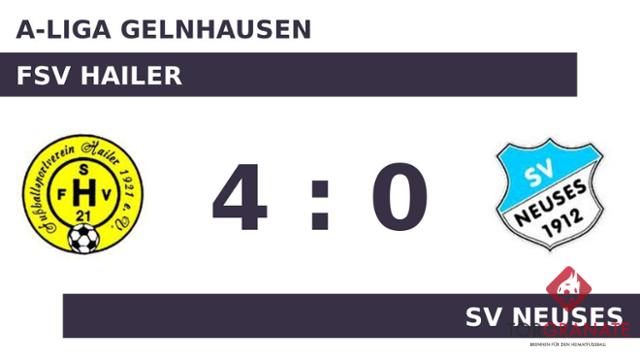 Der SV Neuses geriet schon in der dritten Minute in Rückstand, als Maurice Foucar das schnelle 1:0 für den FSV Hailer erzielte. Andrew Jordan Weber nutzte die Chance für den FSV Hailer und beförderte in der 33. Minute das Leder zum 2:0 ins Netz. Mit der Führung für die Gastgeber ging es in die Halbzeitpause. Mit dem 3:0 von Paul Neun für den FSV Hailer war das Spiel eigentlich schon entschieden (50.). Der vierte Streich des FSV Hailer war Foucar vorbehalten (82.). Insgesamt reklamierte der FSV Hailer gegen den SV Neuses einen ungefährdeten Heimerfolg für sich.