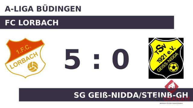 Philip Bielinski trug sich in der 21. Spielminute in die Torschützenliste ein. Zum psychologisch ungünstigen Zeitpunkt vor der Halbzeit (45.) schoss Paul Podoljaka einen weiteren Treffer für FC Lorbach. In Durchgang zwei lief Ali Duman anstelle von Andreas Wirth für das Geiß-Nidda/Steinb-GH auf. Ohne weitere Tore ging es in die Pause. Den Vorsprung von FC Lorbach ließ Marcel Schwalm in der 62. Minute anwachsen. Wenig später kamen Ali Bagbasi und Pavel Usov per Doppelwechsel für Viktor Schulz und Tom Fassbinder auf Seiten des Spitzenreiters ins Match (62.). Durch ein Eigentor der SG Geiß-Nidda/Steinb-GH verbesserte FC Lorbach den Spielstand auf 4:0 für sich (74.). K. A. war es, der kurz vor Ultimo das 5:0 besorgte und FC Lorbach inklusive Anhang damit von höheren Gefilden träumen lässt (90.). Letztlich feierte FC Lorbach gegen das Geiß-Nidda/Steinb-GH nach einer überzeugenden Darbietung einen verdienten Heimsieg.