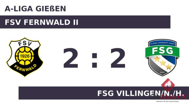 Sean Louis Reiprich brachte den FSV Fernwald II per Doppelschlag ins Hintertreffen, als er in der achten und 43. Minute vollstreckte. Es waren die Gäste, die zur Pause eine Führung ihr Eigen nannten. In Durchgang zwei lief Mamoudou Conde anstelle von Elias Chitiyo für den FSV Fernwald II auf. Die Einwechslung von Leon Schönberger, welcher für Halim Guendogan kam, sollte die Heimmannschaft wachrütteln (63.). Luca Kurz war es, der in der 67. Minute das Spielgerät im Gehäuse der FSG Villingen/N./H. unterbrachte. Die komfortable Halbzeitführung der Gäste hielt nicht bis zum Abpfiff, denn Schönberger schoss den Ausgleich in der 81. Spielminute. Die FSG Vill/Non/Hungen ließ nach dem Wiederanpfiff stark nach und so erkämpfte sich der FSV Fernwald II noch ein Unentschieden.