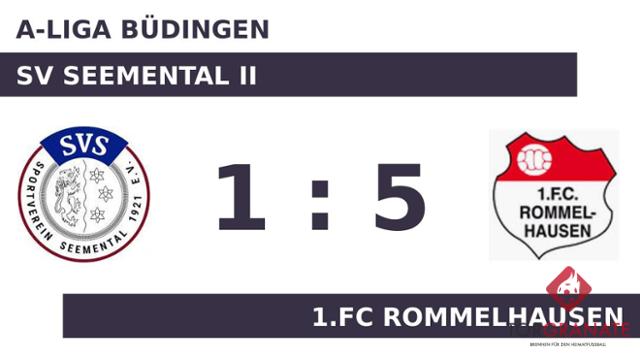 SV Seemental II geriet schon in der siebten Minute in Rückstand, als Hicolae-Laurentiu Cehusa das schnelle 1:0 für den 1.FC Rommelhausen erzielte. Wenig später verwandelte Ingo Riehl einen Elfmeter zum 2:0 zugunsten des 1.FC Rommelhausen (24.). Mit dem 3:0 durch Ion Maftei schien die Partie bereits in der 26. Minute mit den Gästen einen sicheren Sieger zu haben. Das letzte Tor der turbulenten Startphase markierte Liam Kratz in der 29. Minute. Nach nur 30 Minuten verließ Liam Kratz von SV Seemental II das Feld, Johannes Neunert kam in die Partie. Die Hintermannschaft der Gastgeber ließ bis zur Pause kein weiteres Tor zu und es ging bei unverändertem Stand in die Kabinen. Das 4:1 für den 1.FC Rommelhausen stellte Cehusa sicher. In der 62. Minute traf er zum zweiten Mal während der Partie. Ilie Bandol besorgte in der Schlussphase schließlich den fünften Treffer für den 1.FC Rommelhausen (78.). Letztlich fuhr der 1.FC Rommelhausen einen souveränen Erfolg ein, dessen Grundstein im ersten Spielabschnitt gelegt worden war.