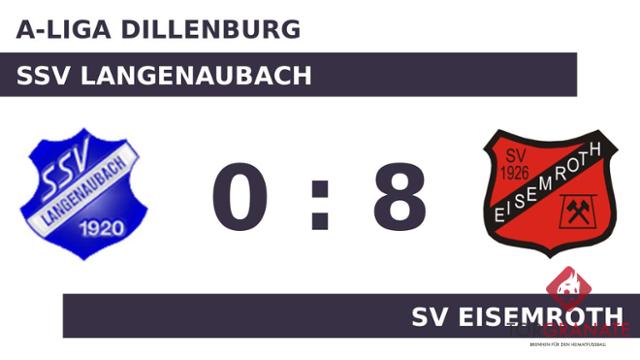 Sebastian Henn schoss in der fünften Minute vom Elfmeterpunkt das erste Tor des Spiels für den SV Eisemroth. Für Tobias Deusing war der Einsatz nach 15 Minuten vorbei. Für ihn wurde Marcell Haupt eingewechselt. Doppelpack für den SV Eisemroth: Nach seinem ersten Tor (17.) markierte Dino Duvnjak wenig später seinen zweiten Treffer (22.). Der Gast baute die Führung aus, indem Mücahid Güzel zwei Treffer nachlegte (24./26.). Den Vorsprung des SV Eisemroth ließ Björn Diebel in der 32. Minute anwachsen. In der ersten Hälfte wurde der SSV Langenaubach nach Strich und Faden auseinandergenommen, was zur Pause in einen desolaten Rückstand mündete. Der SV Eisemroth konnte mit dem ersten Durchgang sehr zufrieden sein. Trotzdem gab es Veränderungen beim SV Eisemroth. Leon Lotz ersetzte Jan Patrick Petry, der nun schon vorzeitig Feierabend machte. Mit dem Tor zum 7:0 steuerte Diebel bereits seinen zweiten Treffer an diesem Tag bei (55.). Der achte Streich des SV Eisemroth war Güzel vorbehalten (75.). Schlussendlich setzte sich der SV Eisemroth mit acht Toren durch und machte bereits vor dem Seitenwechsel klar, welche Mannschaft als Sieger vom Platz gehen würde.