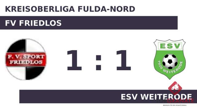 Die erste Halbzeit endete ohne ein zählbares Ereignis für beide Mannschaften. Marco Bode war es, der in der 59. Minute das Spielgerät im Gehäuse des FV Friedlos unterbrachte. Der für Max Eisel ins Spiel gekommene Pascal Augustin sollte in der Offensive ein Zeichen setzen (71.). Augustin sicherte seiner Mannschaft kurz vor dem Abpfiff den Ausgleich, als er in der 90. Minute ins Schwarze traf. Am Ende stand es zwischen dem FV Friedlos und dem ESV Weiterode pari.