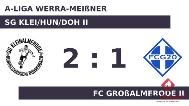Kevin Ziegler stellte die Weichen für die SG Klei/Hun/Doh II auf Sieg, als er in Minute elf mit dem 1:0 zur Stelle war. Großalmerode II brauchte den Ausgleich, aber die Führung der SG Klei/Hun/Doh II hatte bis zur Pause Bestand. In der 75. Minute brachte Derick Ismailj Mkwenjele den Ball im Netz der SG Klei/Hun/Doh II unter. Das Spiel neigte sich seinem Ende entgegen, als Marius Lange den entscheidenden Führungstreffer für den Ligaprimus erzielte (83.). Mit Ablauf der Spielzeit schlug die SG Klei/Hun/Doh II den FC Großalmerode II 2:1.
