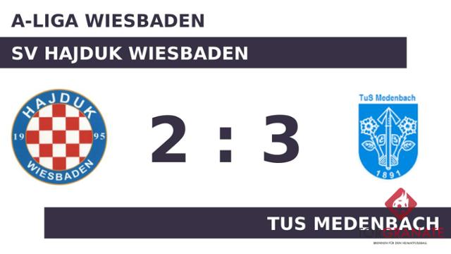 Andre Lehr beförderte das Leder zum 1:0 des TuS Medenbach in die Maschen (15.). Aus der Ruhe ließ sich der SV Hajduk Wiesbaden nicht bringen. Vlado Barbaric erzielte wenig später den Ausgleich (21.). Das letzte Tor der turbulenten Startphase markierte Gojo Kolak in der 23. Minute. Der SV Hajduk Wiesbaden hatte zur Pause eine knappe Führung auf dem Zettel stehen. Timo Kern traf zum 2:2 zugunsten des TuS Medenbach (78.). Dass der TuS Medenbach in der Schlussphase auf den Sieg hoffte, war das Verdienst von Manuel Ulm, der in der 79. Minute zur Stelle war. Mit dem Schlusspfiff durch Schiedsrichter Egon Maurer (Bad Camberg) stand der Auswärtsdreier für den TuS Medenbach. Man hatte sich gegen den SV Hajduk Wiesbaden durchgesetzt.