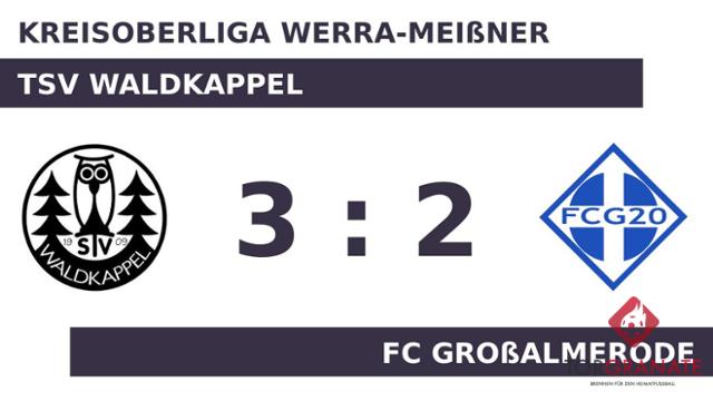 In der zehnten Minute verwandelte Janis Futh einen Elfmeter zum 1:0 für den FC Großalmerode. Jonas Müller erhöhte für den Gast auf 2:0 (17.). Robin Brack traf zum 1:2 zugunsten des TSV Waldkappel (33.). Wenige Momente vor dem Seitenwechsel war Lukas Krengel mit dem 2:2 für die Heimmannschaft zur Stelle (44.). Zur Halbzeit war die Partie noch vollkommen offen. Remis lautete das Zwischenresultat. Sechs Minuten später ging der TSV Waldkappel durch den zweiten Treffer von Brack in Führung. Die Zeichen standen auf Sieg für den FC Großalmerode, doch gab man eine sichere Führung aus der Hand und kassierte letztlich eine bittere Niederlage.
