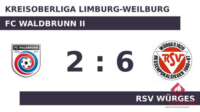 Das erste Tor des Spiels ging an den Gast. Allerdings gelang dies nur mithilfe des FC Waldbrunn II: 1:0 für den RSV Würges durch ein Eigentor in der ersten Minute. Der FC Waldbrunn II zeigte sich wenig beeindruckt. In der fünften Minute schlug Marvin Mendel mit dem Ausgleich zurück. Miguel Granja versenkte die Kugel zum 2:1 (6.). Das letzte Tor der turbulenten Startphase markierte Ilias Abarkan in der 15. Minute. Die Hintermannschaft des FC Waldbrunn II ließ bis zur Pause kein weiteres Tor zu und es ging bei unverändertem Stand in die Kabinen. Für den nächsten Erfolgsmoment des RSV Würges sorgte Alen Nukovic (66.), ehe Jermaine Pedraza das 5:1 markierte (80.). Mit dem Treffer zum 2:5 in der 84. Minute machte Mendel zwar seinen Doppelpack perfekt – der Rückstand zum RSV Würges war jedoch weiterhin gewaltig. Youness Lmadaghri war es, der kurz vor Ultimo das 6:2 besorgte und den RSV Würges inklusive Anhang damit von höheren Gefilden träumen lässt (90.). Ein starker Auftritt ermöglichte dem RSV Würges am Sonntag einen ungefährdeten Erfolg gegen den FC Waldbrunn II.