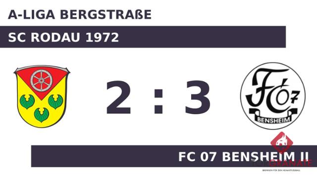 Der SC Rodau 1972 geriet schon in der achten Minute in Rückstand, als Dustin Koob das schnelle 1:0 für den FC 07 Bensheim II erzielte. In der 19. Minute brachte Daniel Scheuren das Netz für den FC 07 Bensheim II zum Zappeln. Mamadou Bah verkürzte für den SC Rodau 1972 später in der 27. Minute auf 1:2. Für das 3:1 des FC 07 Bensheim II zeichnete Robin Gielow verantwortlich (39.). Es waren die Gäste, die zur Pause eine Führung ihr Eigen nannten. Mit dem zweiten Treffer von Bah rückte der SC Rodau 1972 wieder ein wenig an den FC 07 Bensheim II heran (67.). Obwohl dem FC 07 Bensheim II nach erfolgreicher erster Hälfte keine weiteren Tore gelangen, schaffte es der SC Rodau 1972 zugleich nicht, die Partie zu drehen. Sie endete mit 3:2.