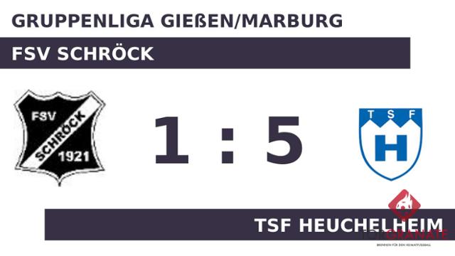Michael Rohde brachte sein Team in der 16. Minute nach vorn. Sebastian Umsonst beförderte das Leder zum 2:0 der TSF Heuchelheim über die Linie (26.). Die Hintermannschaft des FSV Schröck ließ bis zur Pause kein weiteres Tor zu und es ging bei unverändertem Stand in die Kabinen. Umsonst legte in der 53. Minute zum 3:0 für die TSF Heuchelheim nach. Wenig später kamen Alessio Canevese und Mathias Öbbeke per Doppelwechsel für Toki Hiromoto und Jason Schmitt auf Seiten des FSV Schröck ins Match (64.). Die Schröcker verkürzten den Rückstand in der 79. Minute durch einen Elfmeter von Matthias Lutz auf 1:3. Rohde gelang ein Doppelpack (82./87.), mit dem er das Ergebnis auf 5:1 hochschraubte. Am Schluss gewann die TSF Heuchelheim gegen den FSV Schröck.