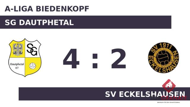 Der SV Eckelshausen geriet schon in der neunten Minute in Rückstand, als Kadir Cam das schnelle 1:0 für die SG Dautphetal erzielte. Der SV Eckelshausen musste den Treffer von Lukas Dinkel zum 2:0 hinnehmen (19.). Alessandro Montagnino verkürzte für das Schlusslicht später in der 31. Minute auf 1:2. Wenige Momente vor dem Seitenwechsel war Yasin Mete mit dem 2:2 für den Gast zur Stelle (43.). Eine Aussage darüber, wer am Ende die Nase vorn haben würde, war nach dem Abpfiff der ersten Halbzeit noch nicht zu treffen. Es ging mit einem Gleichstand in die Kabinen. Per Elfmeter erhöhte Cam in der 82. Minute seine Torausbeute an diesem Tag auf zwei Treffer – 3:2 für die SG Dautphetal. Stephen Jäckel versenkte die Kugel zum 4:2 für das Heimteam (84.). Am Ende stand die SG Dautphetal als Sieger da und behielt die drei Punkte verdient zu Hause.