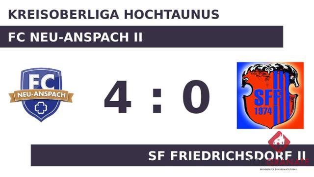 Die erste Halbzeit endete ohne ein zählbares Ereignis für beide Mannschaften. Mit einem schnellen Doppelpack (56./61.) zum 2:0 schockte Gerome Dominic Rossner die SF Friedrichsdorf II. David Saco Hildago brachte den FC Neu-Anspach II in ruhiges Fahrwasser, indem er das 3:0 erzielte (81.). Der vierte Streich des FC Neu-Anspach II war Mato Maros vorbehalten (89.). Letztlich feierte der FC Neu-Anspach II gegen die SF Friedrichsdorf II nach einer überzeugenden Darbietung einen verdienten Heimsieg.