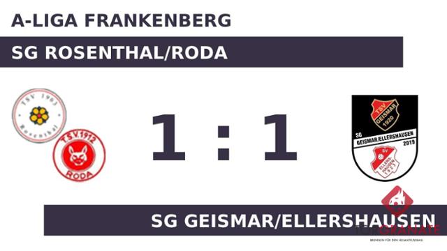 Nach den ersten 45 Minuten ging es für die SG Rosenthal/Roda und die SG Geismar/Ellershausen ohne Torerfolg in die Kabinen. Louis Schween brach für das Geismar/Ellershausen den Bann und markierte in der 68. Minute die Führung. Der Treffer, der Jan-Philipp Lay in der 90. Minute gelang, bescherte seiner Mannschaft kurz vor dem Ende noch den Ausgleich. Am Ende stand ein Teilerfolg für beide Mannschaften. Die SG Rosenthal/Roda und die SG Geismar/Ellershausen spielten unentschieden.