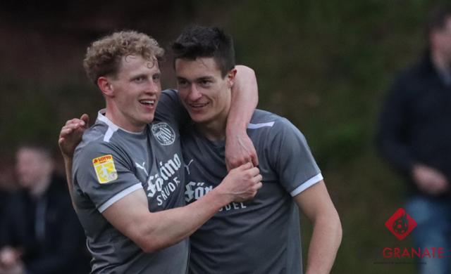 Komm her, mein Freund! Niklas Budesheim (rechts) hat soeben das 1:0 für den SV Steinbach erzielt. Max Stadler ist erster Gratulant. Dass der SVS noch gegen Hadamar verlieren sollte, ahnte zu diesem Zeitpunkt niemand. © Mediennetzwerk Osthessen/Bernd Vogt