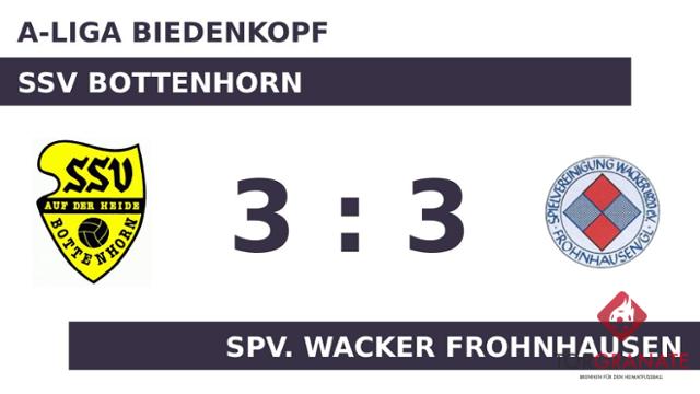 Jan Zimmermann brachte sein Team in der 34. Minute nach vorn. Geschockt zeigte sich die Spv. Wacker Frohnhausen nicht. Nur wenig später war Tobias Lang mit dem Ausgleich zur Stelle (40.). Zur Halbzeit war die Partie noch vollkommen offen. Remis lautete das Zwischenresultat. Der Treffer zum 2:1 sicherte dem SSV Bottenhorn nicht nur die Führung – es war auch bereits der zweite von Zimmermann in diesem Spiel (53.). Fabian Staus verwandelte in der 74. Minute einen Elfmeter und baute den Vorsprung des Heimteams auf 3:1 aus. Das 2:3 der Spv. Frohnhausen bejubelte Christian Immel (76.). Lang sicherte seiner Mannschaft kurz vor dem Abpfiff den Ausgleich, als er in der 90. Minute ins Schwarze traf. Schließlich gingen der SSV Bottenhorn und die Spv. Wacker Frohnhausen mit einer Punkteteilung auseinander.