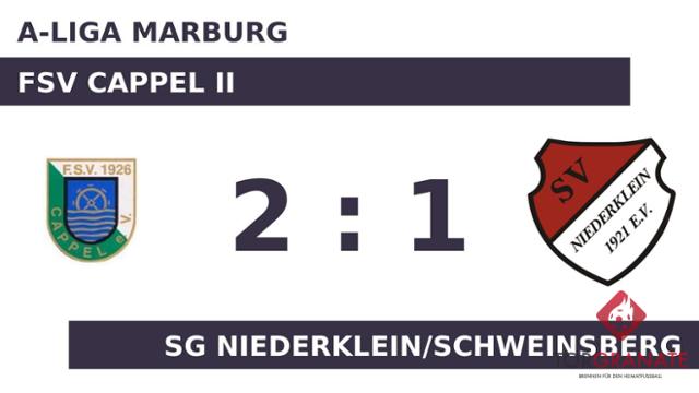 Der Gast erwischte einen Blitzstart ins Spiel. Niklas Schick traf in der fünften Minute zur frühen Führung. Die SG Niederklein/Schweinsberg bejubelte noch das letzte Erfolgserlebnis, als Richard Josef Rudolf Rixgens für den Ausgleich sorgte (11.). Ohne weitere Tore ging es in die Pause. Devin Torres brachte dem FSV Cappel II nach 69 Minuten die 2:1-Führung. Nach Beendigung der zweiten Halbzeit hieß das Ergebnis 2:1 zugunsten des Gastgebers.