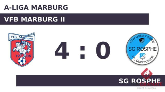 Tim Kevin Blüder musste nach nur 20 Minuten vom Platz, für ihn spielte Tim Florek weiter. Ein Doppelpack brachte den VfB Marburg II in eine komfortable Position: Paul Jost war gleich zweimal zur Stelle (21./28.). Für ruhige Verhältnisse sorgte Maximilian Ermler, als er das 3:0 für den Gastgeber besorgte (36.). Die Überlegenheit des VfB Marburg II spiegelte sich in einer deutlichen Halbzeitführung wider. Eigentlich war die SG Rosphe schon geschlagen, als Ermler das Leder zum 0:4 über die Linie beförderte (52.). Am Ende blickte der VfB Marburg II auf einen klaren 4:0-Heimerfolg über die Gäste.