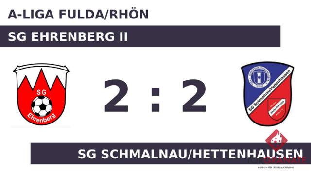 Für das erste Tor der SG Schmalnau/Hettenhausen war Jure-Ivan Madzar verantwortlich, der in der 17. Minute das 1:0 besorgte. Zum psychologisch wichtigen Zeitpunkt kurz vor der Halbzeit (44.) traf Christopher Gürtler zum Ausgleich für die SG Ehrenberg II. Der Treffer zum 2:1 sicherte Schmaln./Hettenh. nicht nur die Führung – es war auch bereits der zweite von Madzar in diesem Spiel (45.). Die Pausenführung des Ligaprimus fiel knapp aus. Stefan Freier witterte seine Chance und schoss den Ball zum 2:2 für die SG Ehrenberg II ein (81.). Am Schluss sicherte sich die SG Ehrenberg II gegen die SG Schmalnau/Hettenhausen einen Zähler.