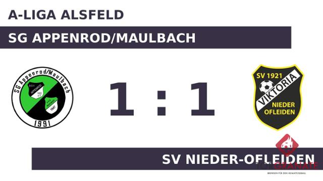Marcel Stumpf brachte die SG Appenrod/Maulbach in der 22. Minute in Front. Nach nur 27 Minuten verließ Andrej Bruch von der SG Appenrod/Maulbach das Feld, Kim Ruehl kam in die Partie. Mit einem Wechsel – Bjoern Luft kam für Ruehl – startete die SG Appenrod/Maulbach in Durchgang zwei. Ohne weitere Tore ging es in die Pause. Die SG Appenrod/Maulbach musste den Treffer von Jannik Erb zum 1:1 hinnehmen (54.). Am Schluss hatte im Duell der beiden Mannschaften keine die Oberhand gewonnen und so trennten sich die SG Appenrod/Maulbach und der SV Nieder-Ofleiden schließlich mit einem Remis.
