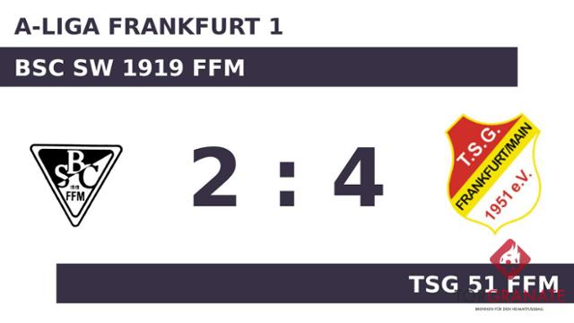 Niklas Zarins brachte die TSG 51 Ffm in der 19. Spielminute in Führung. Doppelpack für die TSG 51 Ffm: Nach seinem ersten Tor (26.) markierte Marcel Falkenmayer wenig später seinen zweiten Treffer (29.). Der BSC SW 1919 Ffm verkürzte den Rückstand in der 45. Minute durch einen Elfmeter von Yassin Chaouki auf 1:3. Es waren die Gäste, die zur Pause eine Führung ihr Eigen nannten. In der Pause stellte der BSC SW 1919 Ffm personell um: Per Doppelwechsel kamen Hicham Abdesadki und Özkan Ucar auf den Platz und ersetzten Elias Jennaoui und Henok Yemane. Es folgte der Anschlusstreffer für die Gastgeber – bereits der zweite für Chaouki. Nun stand es nur noch 2:3 (52.). Mit dem 4:2 sicherte Falkenmayer der TSG 51 Ffm nicht nur den Sieg, sondern erzielte auch seinen dritten Tagestreffer (77.). Nach Beendigung der zweiten Halbzeit hieß das Ergebnis 4:2 zugunsten der TSG 51 Ffm.